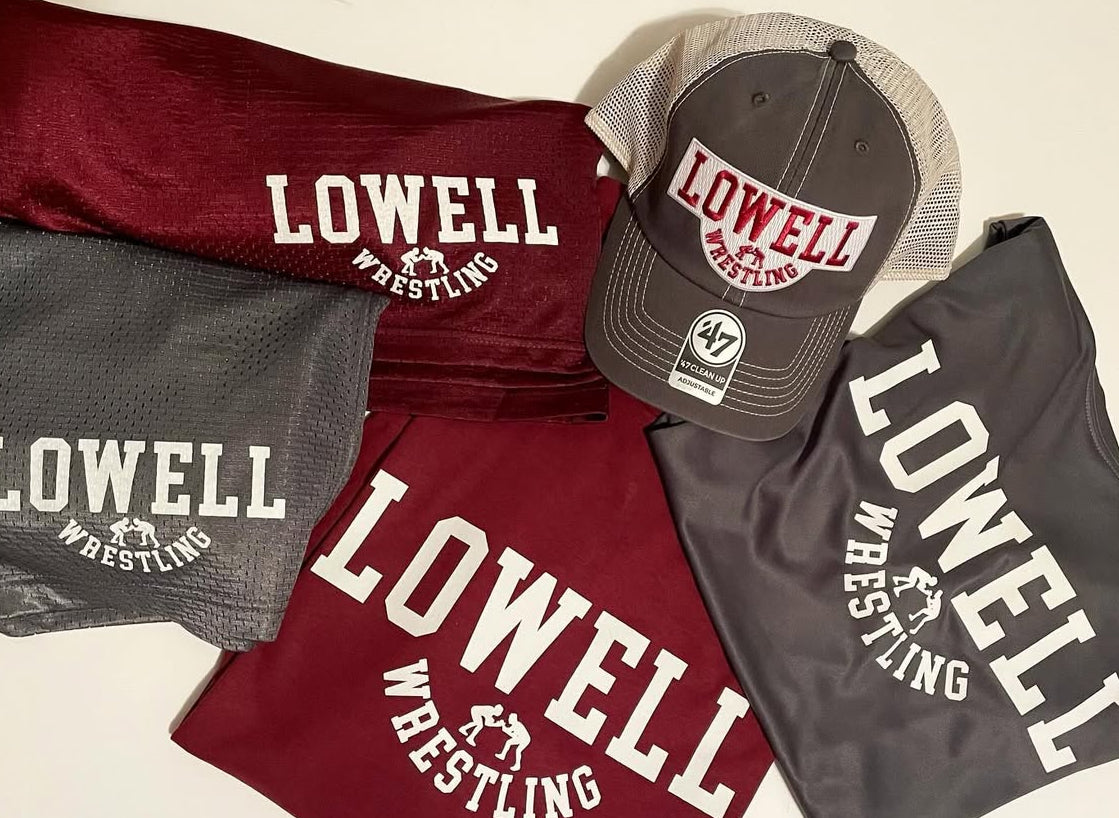 I worked with Lowell High School Wrestling to create this design which I then used to create various shirt, hoodie, shorts and hat offerings.